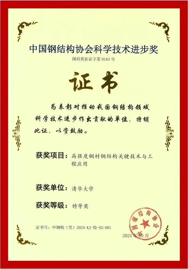 “高强度钢材钢结构关键技术与工程应用”项目由清华大学土木系教授施刚、石永久牵头完成,多位清华土木系系友担任项目主要完成人,包括土木系1995级校友、中建南洋公司董事长钱良忠,土木系1995级校友、中国建筑标准设计研究院教授级高工王喆,土木系2006级校友、北京科技大学教授刘晓刚。项目团队自2005年起,对高强度钢材钢结构的关键技术,按照材料→截面→构件→连接→节点→结构体系的技术路线,开展系统研究并取得创新成果,获得13项国家级科研项目支持,发表学术论文142篇,主编住建部行业标准《高强钢结构设计标准》(JGJ/T 483-2020)等多部标准规范,成果应用于百余项国内外重大和重要钢结构工程,取得了显著的经济、社会和环境效益。