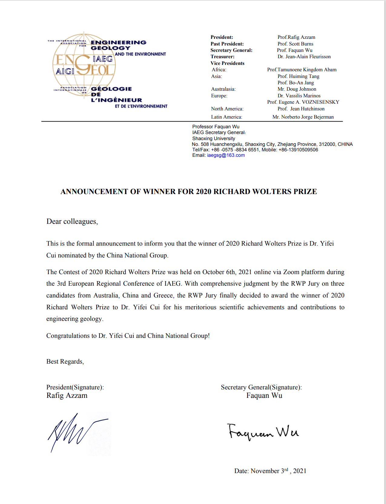 由国际工程地质与环境协会(IAEG)组织的第三届国际工程地质与环境协会(IAEG)欧洲区域工程地质大会于2021年10月6至10日在希腊雅典举行。经线上答辩和评选委员会无记名投票表决,中国地质学会工程地质专业委员会和国际工程地质与环境协会中国委员会推荐的,来自清华大学水利系的崔一飞博士荣获2020年IAEG Richard Wolters Prize。