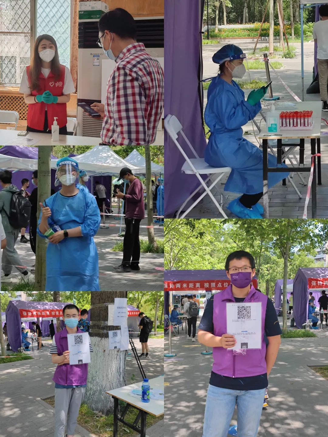 姚钰恬:第一次做核酸检测的志愿者,天气酷热,也是第一次在烈日下穿着防护服,深刻体会到医务工作者和志愿者的辛苦。虽然被防护服勒出了数道痕迹,但感受到同学们的配合与支持,一切都是那么有意义。检测的同学们会把检测码放到适合扫码的位置,方便操作,在本文盲念错名字时相视一笑,有生僻字的名字时同学会自己说出来避免尴尬。一上午很短,但是一段美好的回忆,也希望我们能尽快战胜疫情。